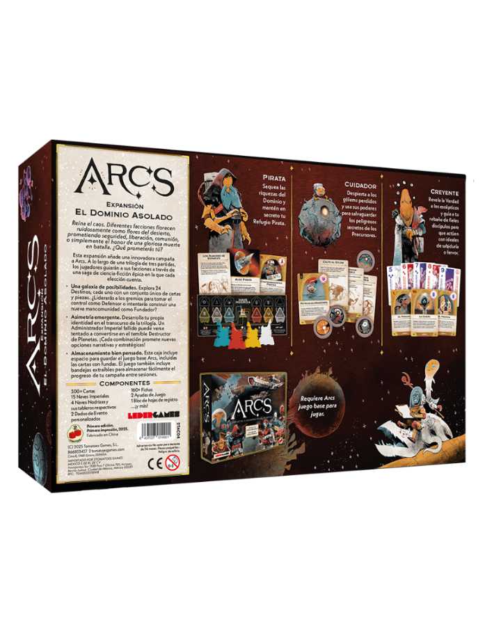 Arcs: el Dominio Asolado es una expansión para el juego de mesa Arcs con la que podrás jugar a una innovadora microcampaña, en la que cada partida es un episodio de una trilogía épica que se extiende a lo largo de una galaxia aún más grande. Comienza en un imperio moribundo y descubre poco a poco como forjar tu propio destino y conquistar la galaxia.