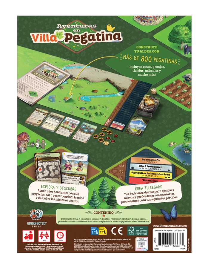 Aventuras en Villa Pegatina es un juego de mesa en el que tus amigos y tú crearéis una aldea entre todos. Aunque es imposible perder la partida, vuestras decisiones provocarán cambios permanentes que tendrán efectos tanto positivos como negativos en la aldea. ¡Intentad obtener logros y felicidad mientras construís la aldea de vuestros sueños!