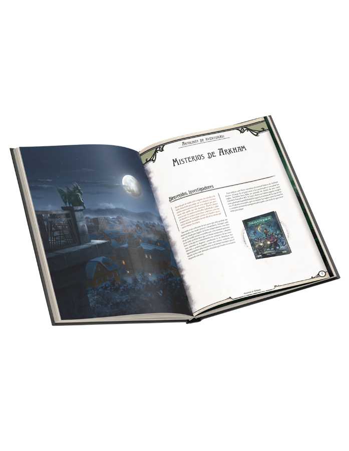 Este libro contiene las reglas básicas de ARKHAM HORROR – EL JUEGO DE ROL, un sistema completo para crear personajes, información sobre la ciudad de Arkham y sus alrededores, un surtido de adversarios y los monstruosos primigenios a los que sirven, y una aventura introductoria para entrar en acción lo antes posible.