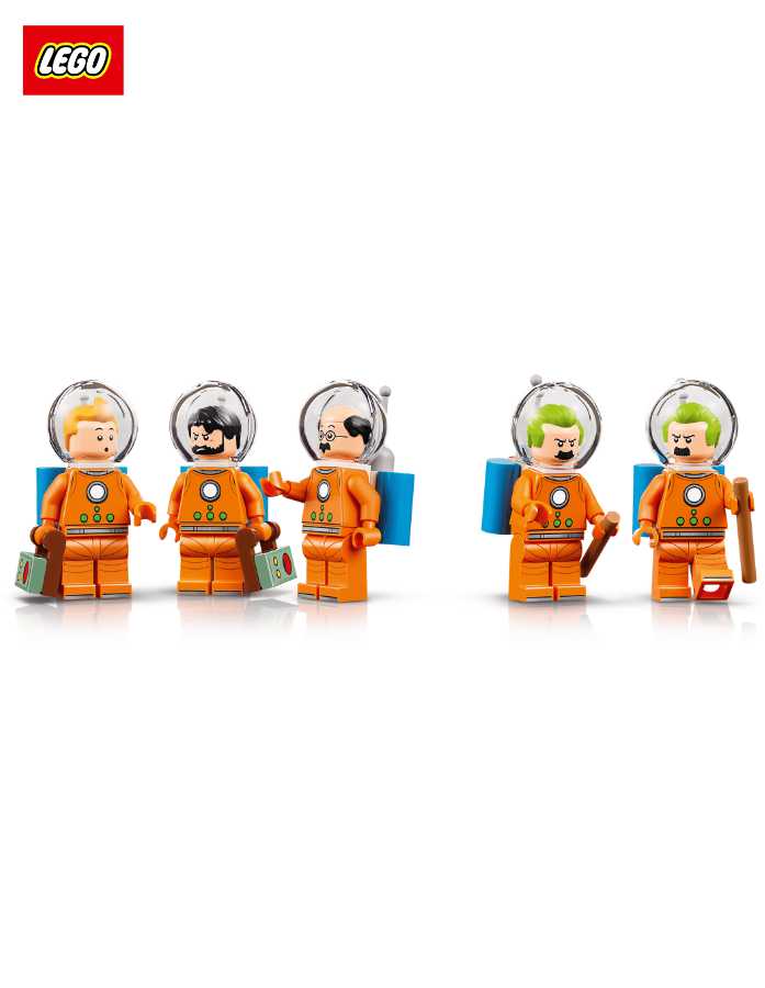 - 6 PERSONAJES DE TINTIN®: Minifiguras LEGO® de Tintin®, Captain Haddock®, Thomson and Thompson® y Professor Calculus®, todos con trajes espaciales, cascos y botellas de oxígeno, así como una figura de Snowy®