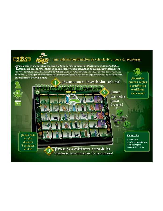 Disfruta de una experiencia única que combina ingeniosamente un calendario y un juego de aventuras. Colócalo en tu escritorio y, cada día, prepárate para enfrentarte a los horrores cósmicos ¡desde el 1 de enero hasta el 31 de diciembre!