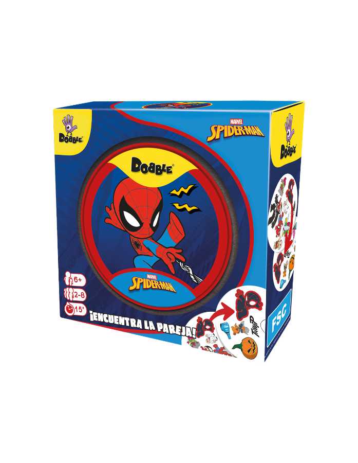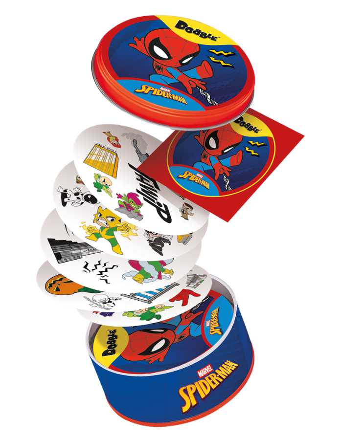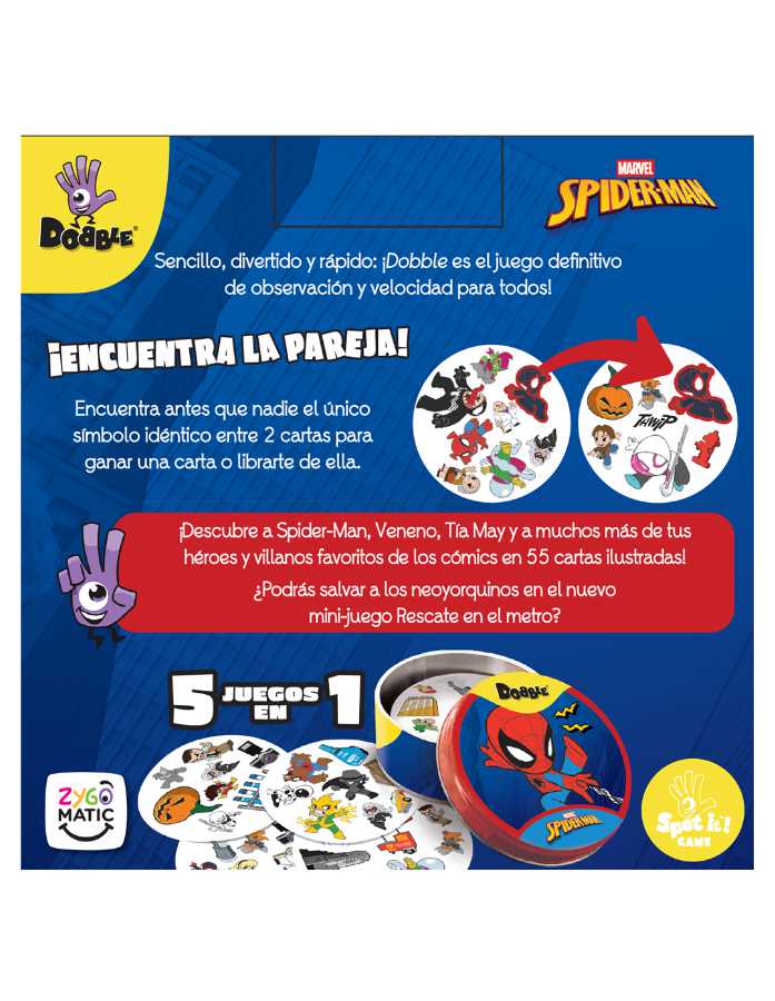 Dobble Spiderman es un juego de cartas en el que tu amigo y vecino favorito es el protagonista del clásico Dobble. ¡Encuentra la pareja!¡Descubre a Spiderman, Venon, Tía May y a muchos más de tus héroes y villanos favoritos! ¿Podrás salvar a los neoyorquinos en el nuevo mini-juego Rescate en el metro?
