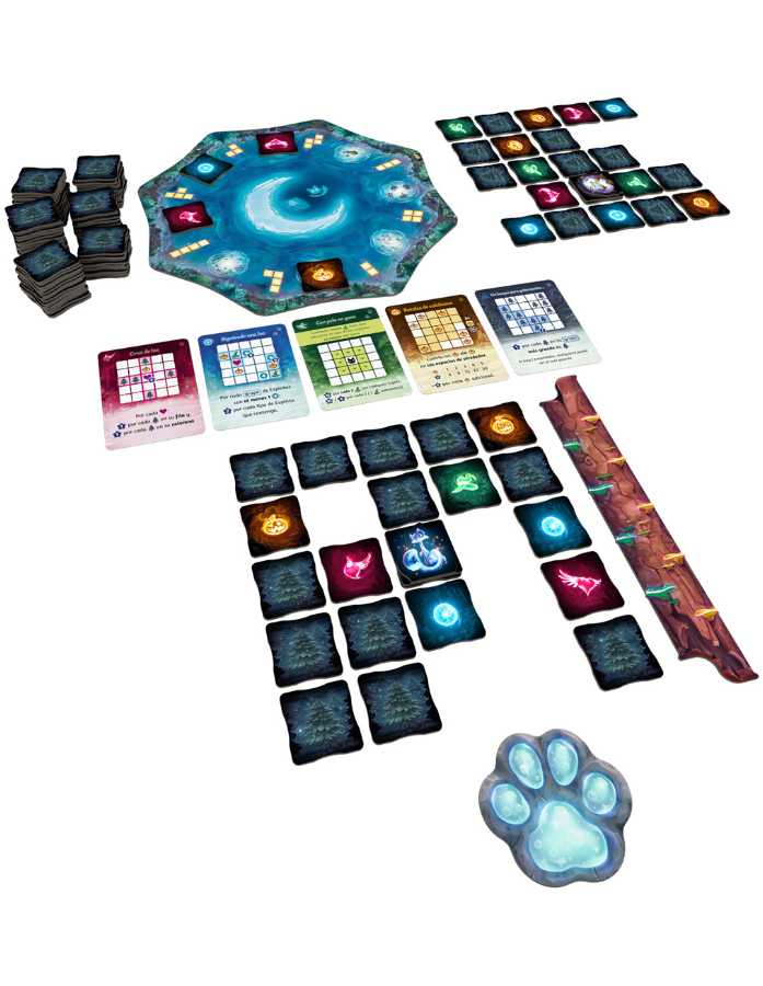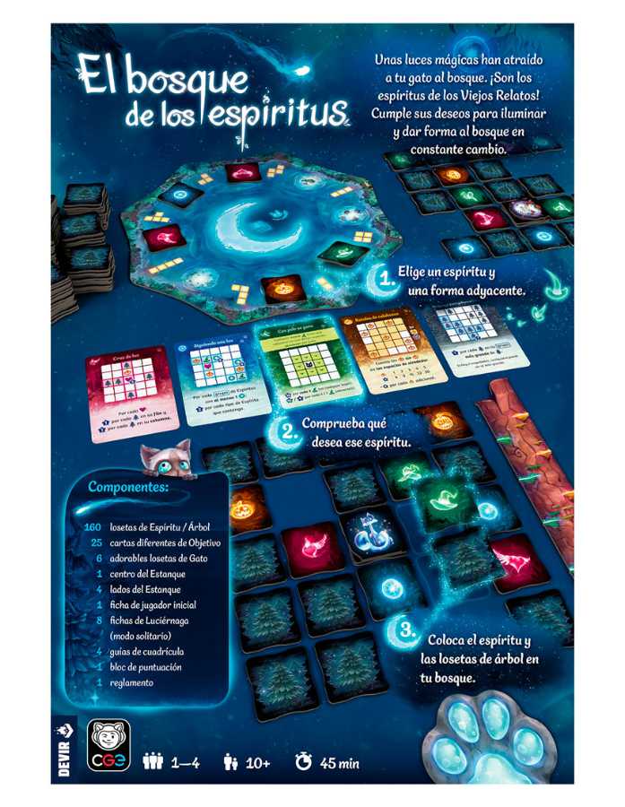 Bienvenido a El Bosque de los Espiritus, un lugar mágico poblado por brillantes fuegos fatuos. En tu turno, elige una ficha de fuego fatuo y una forma para colocar en tu cuadrícula personal, tu propio bosque en crecimiento.