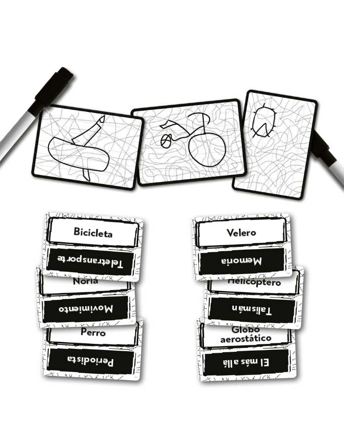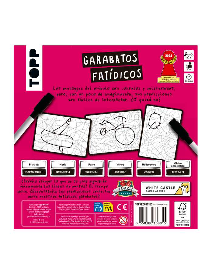 Garabatos Fatidicos es un juego de mesa cooperativo en el que todos los dibujos ya están ahí antes de empezar, solo están a la espera de que vosotros los saquéis del caos. Tenéis que ilustrar las palabras, pero solo podéis hacerlo siguiendo las líneas de puntos.