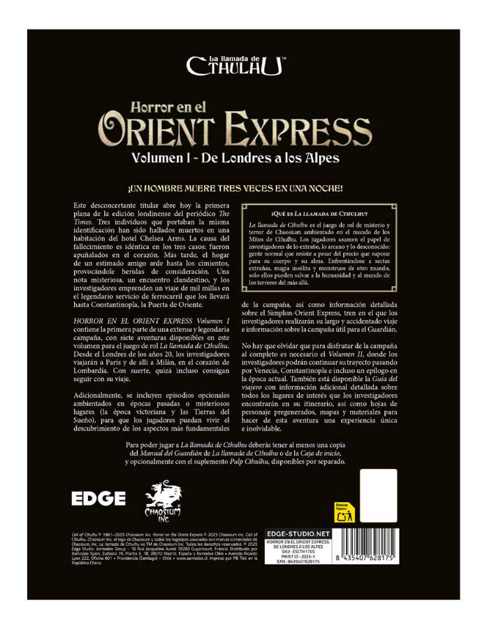 HORROR EN EL ORIENT EXPRESS Volumen I contiene la primera parte de una extensa y legendaria campaña, con siete aventuras disponibles en este volumen para el juego de rol La llamada de Cthulhu. Desde el Londres de los años 20, los investigadores viajarán a París y de allí a Milán, en el corazón de Lombardía. Con suerte, quizá incluso consigan seguir con su viaje.