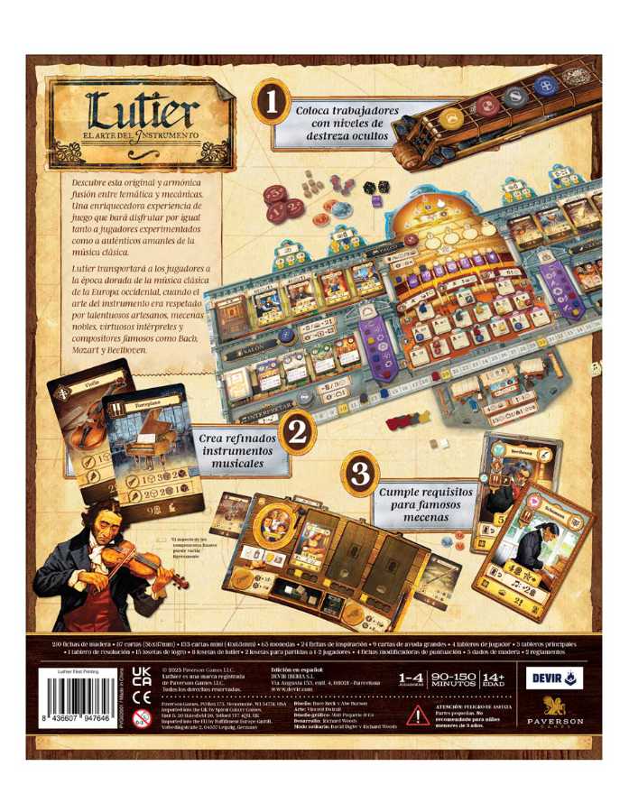 Lutier: El Arte del Instrumento es un juego de mesa que transporta a los jugadores a la época dorada de la música clásica en Europa occidental, cuando el arte de los instrumentos era defendido por igual por hábiles artesanos, nobles mecenas, intérpretes virtuosos y compositores famosos como Bach, Mozart y Beethoven.