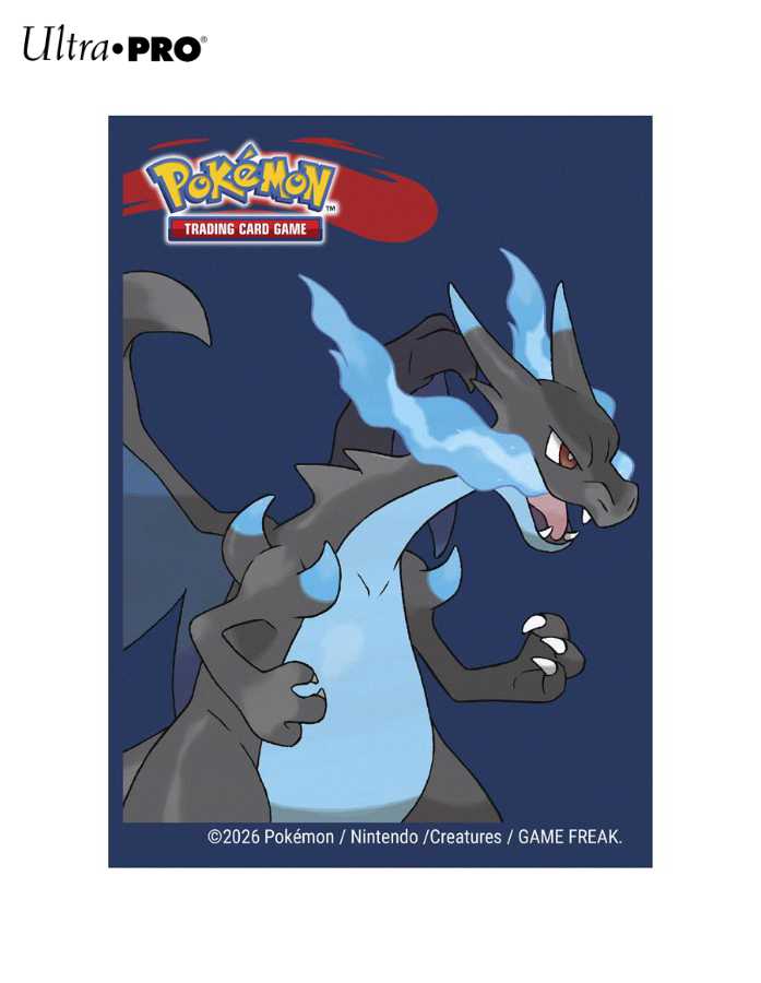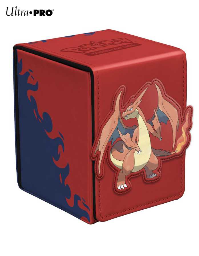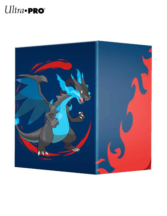 La Caja de Barajas Alcove® Flip Deck Box® para el Juego de Cartas Coleccionables Pokémon presenta una vibrante ilustración a todo color de Mega Charizard X sobre un acabado multicapa de polipiel, con un potente cierre magnético y dos ranuras para el pulgar para facilitar el acceso a tu baraja.