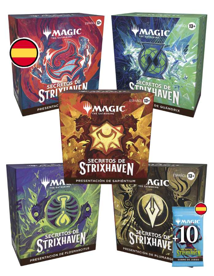 - 1 Sobre Especial Strixhaven, con 14 cartas de 1 Universidad, incluyendo 1 Carta Rara o Rara Mítica foil + 1 Carta Rara o Rara Mítica Foil cualquiera.