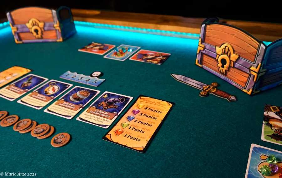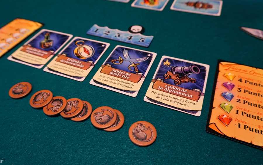 La partida dura cinco días. Cada día, se colocan nuevas gemas en las islas, que se sitúan entre cada par de jugadores. Cada uno tiene 3 cartas en mano: 2 verdes (de cooperación) y 1 roja (de traición). En secreto, elegirás una carta para colocar boca abajo en la isla a tu izquierda y otra en la isla a tu derecha.