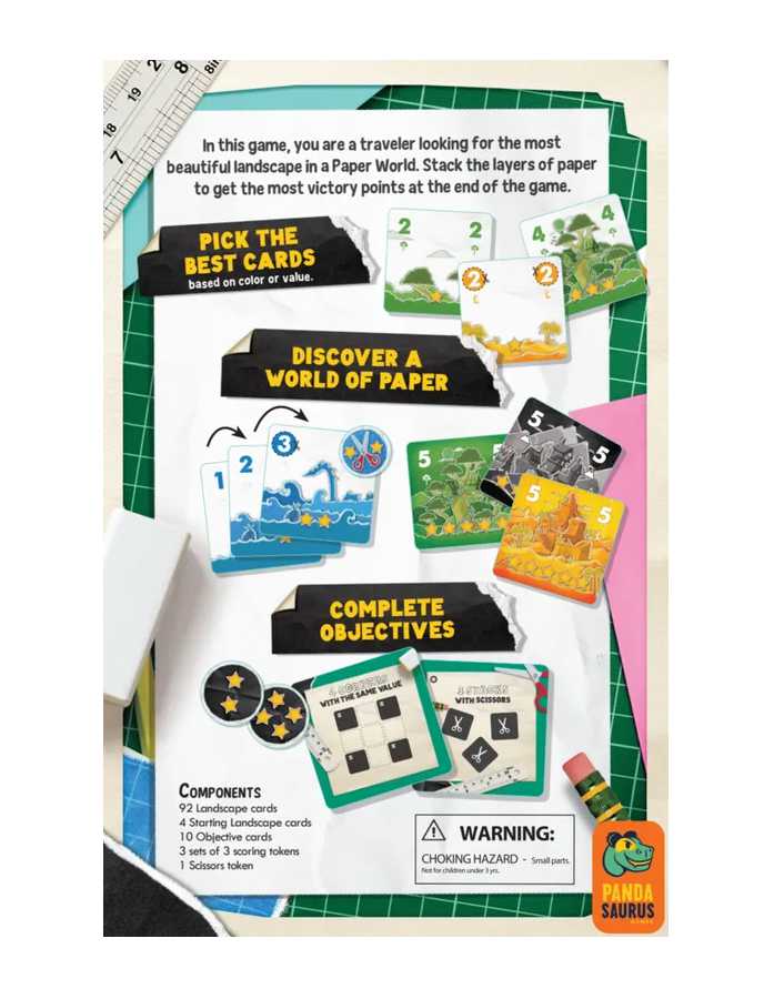 Paper World es un juego de cartas en el que cada jugador asume el papel de un viajero que intenta recrear los paisajes que ha visto durante sus viajes usando capas de papel.