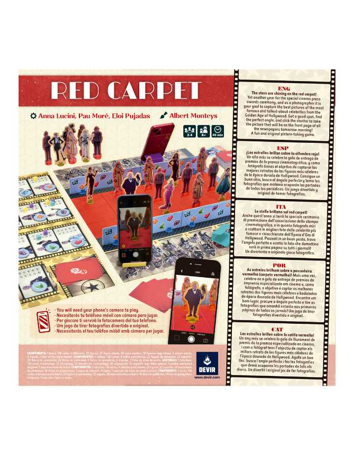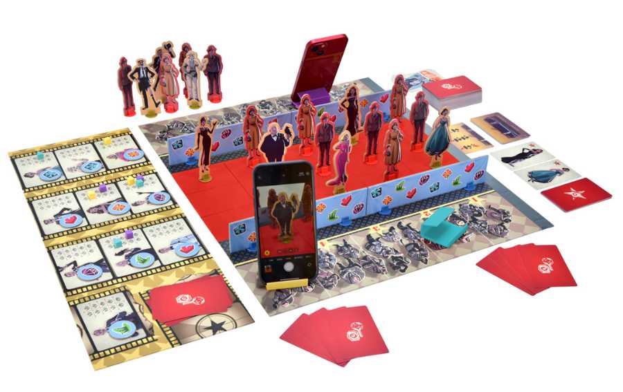 Red Carpet es un juego de mesa en el que encartarás a un fotógrafo que busca capturar los mejores retratos de las celebridades que llegan en limusinas y desfilan por la alfombra roja hacia la gala de premios.
