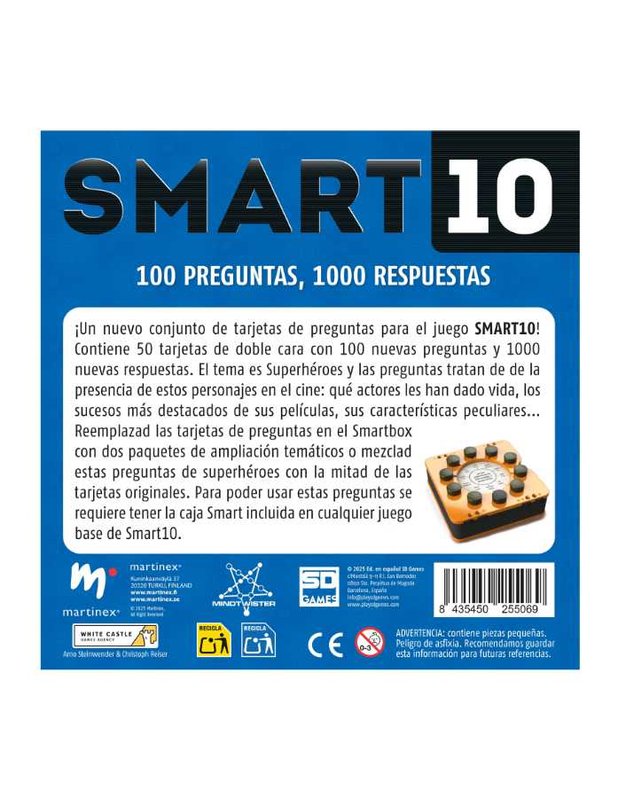 Smart 10: Superheroes – Paquete de Ampliacion es una expansión para el juego de cartas SMART 10 con la que podrás añadir nuevas preguntas a tus partidas relacionadas con el mundo de los superhéroes, para así seguir disfrutando de una experiencia de juego única y diferente.