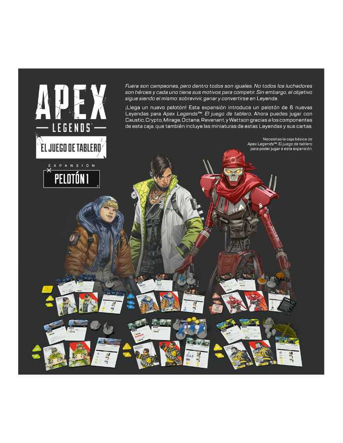 ¡Llega un nuevo pelotón! Ahora puedes jugar con Caustic, Crypto, Mirage, Octane, Revenant, y Wattson gracias a los componentes de esta caja, que también incluye las miniaturas de estas Leyendas y sus cartas.