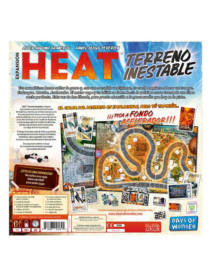 Heat: Terreno Inestable es una expansión para el juego de mesa Heat que te permitirá competir en el calor implacable del desierto sudafricano, y en el emocionante circuito de Alemania.